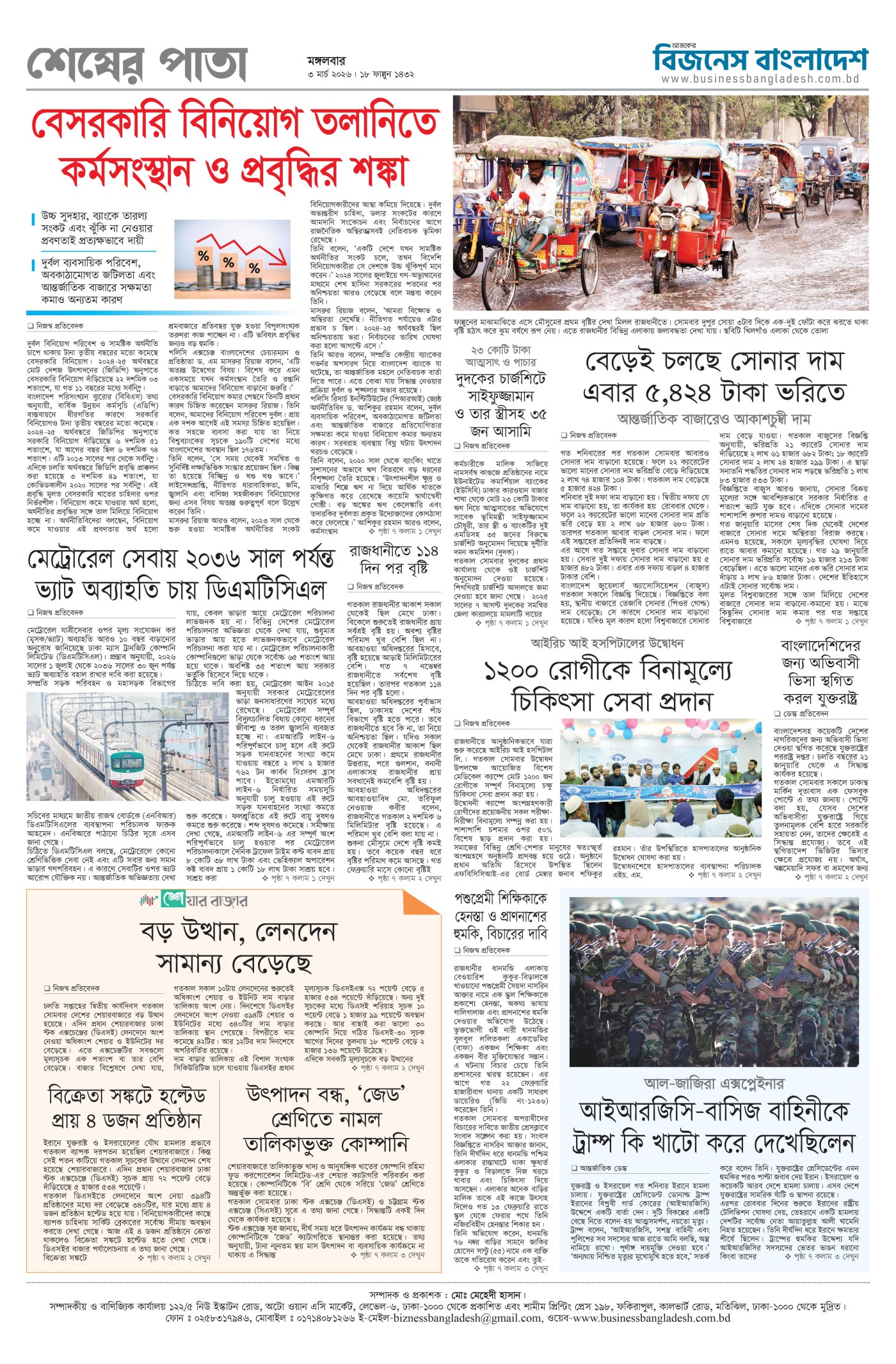 মঙ্গলবার, ০৩ মার্চ ২০২৬, ১৯ ফাল্গুন ১৪৩২, ১৪ই রমজান, ১৪৪৭ হিজরি