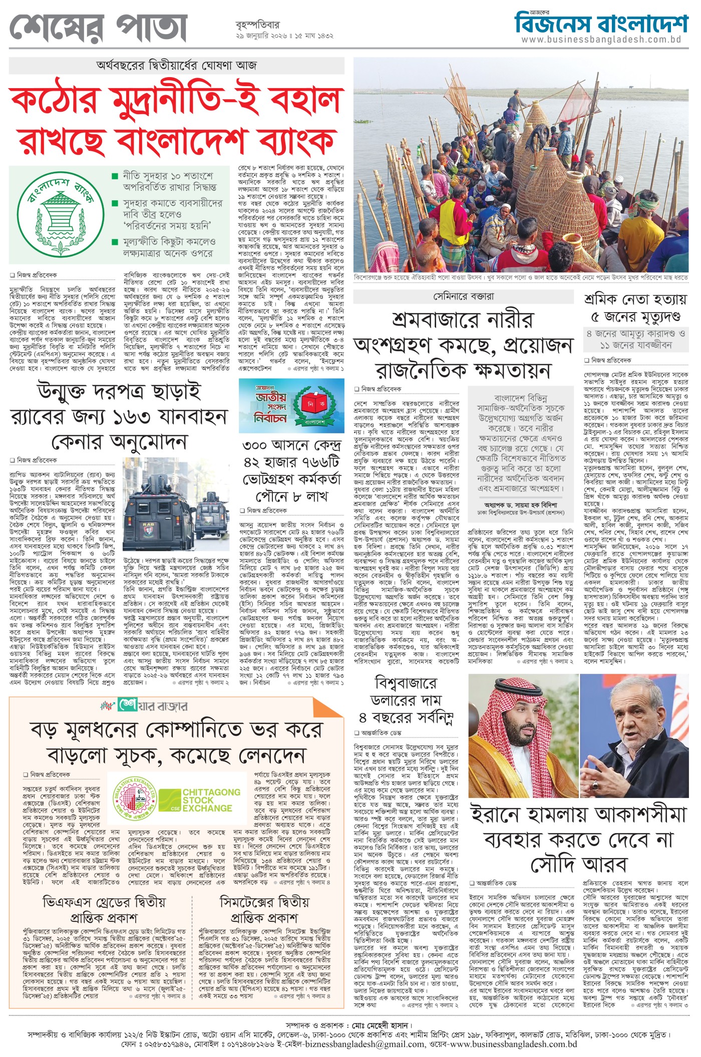 বৃহস্পতিবার, ২৯ জানুয়ারী ২০২৬, ১৬ মাঘ ১৪৩২, ১০ই শাবান, ১৪৪৭ হিজরি